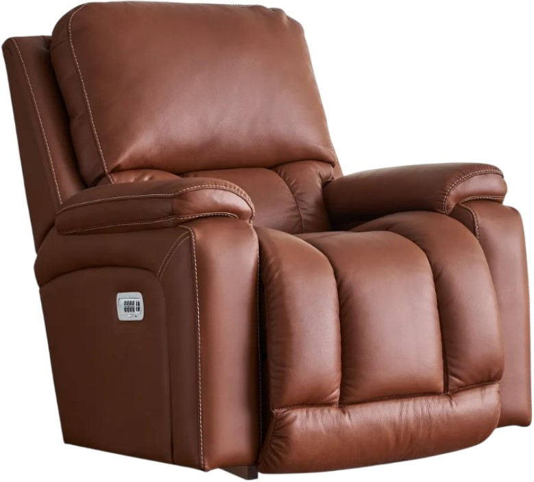 The Greyson Power Rocking Recliner with Headrest and Lumbar offers exceptional comfort with pillow top arms, a deep chaise seat, and a continuous zone of support. Its side panel allows for customizable reclining, while a built-in USB port powers devices.Read More