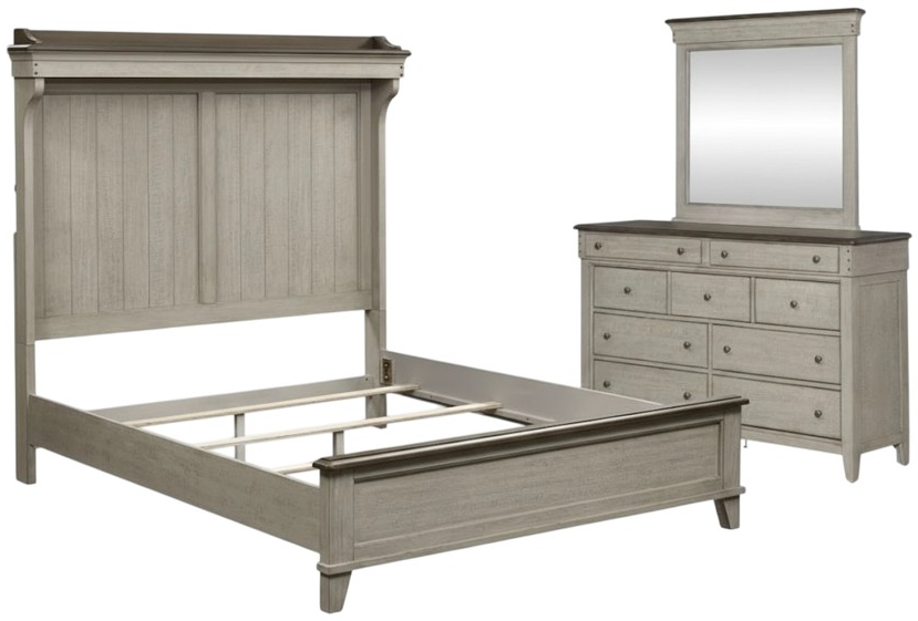 Create a relaxing retreat with the Ivy Hollow queen mantle bed, dresser, and mirror. This kit features full extension drawers with premium felt lined top and cedar lined bottom drawers, offset top drawers to create dimension, framed end panels, pin nail head accents, and antique pewter knob hardware.Read More